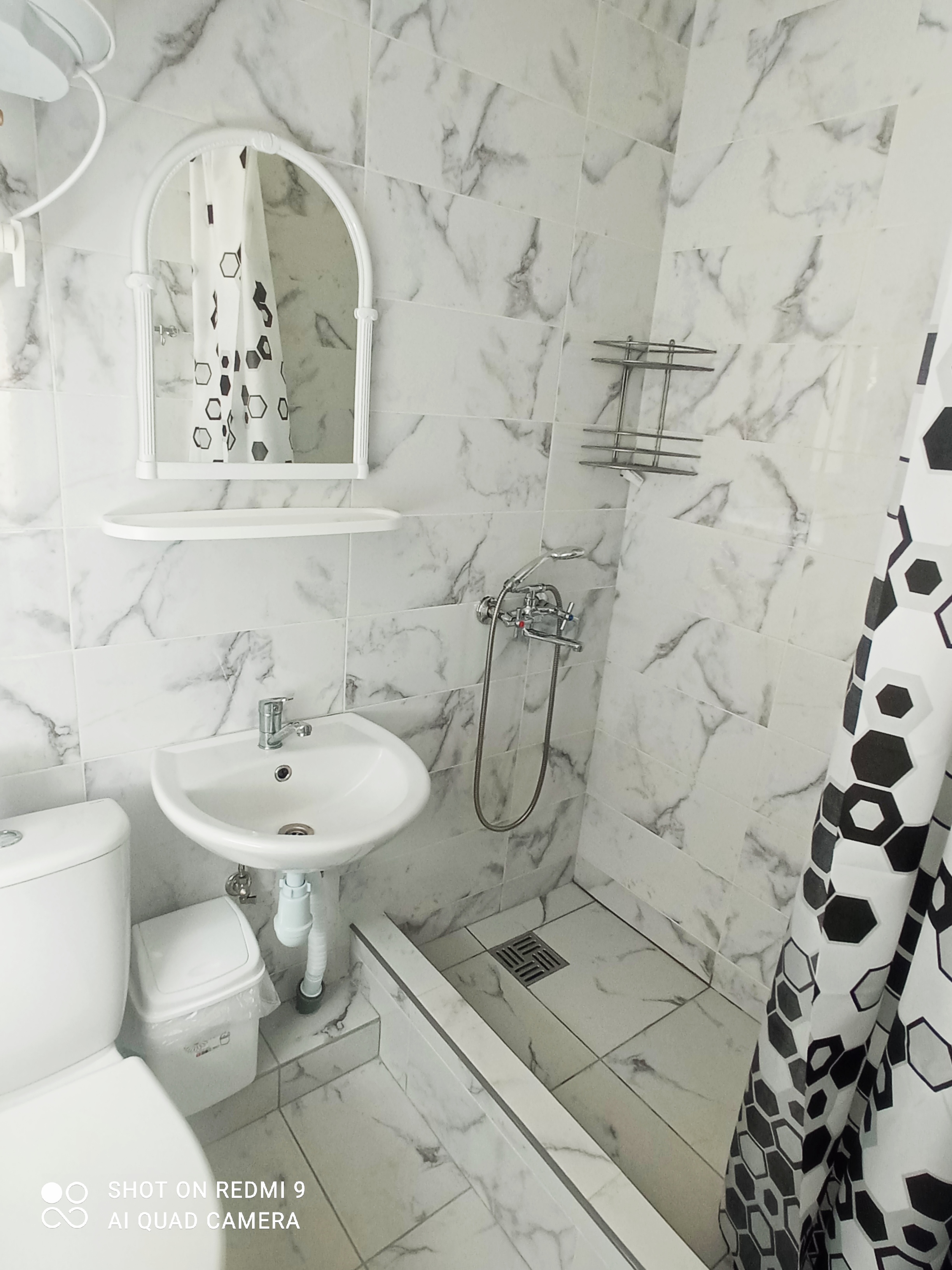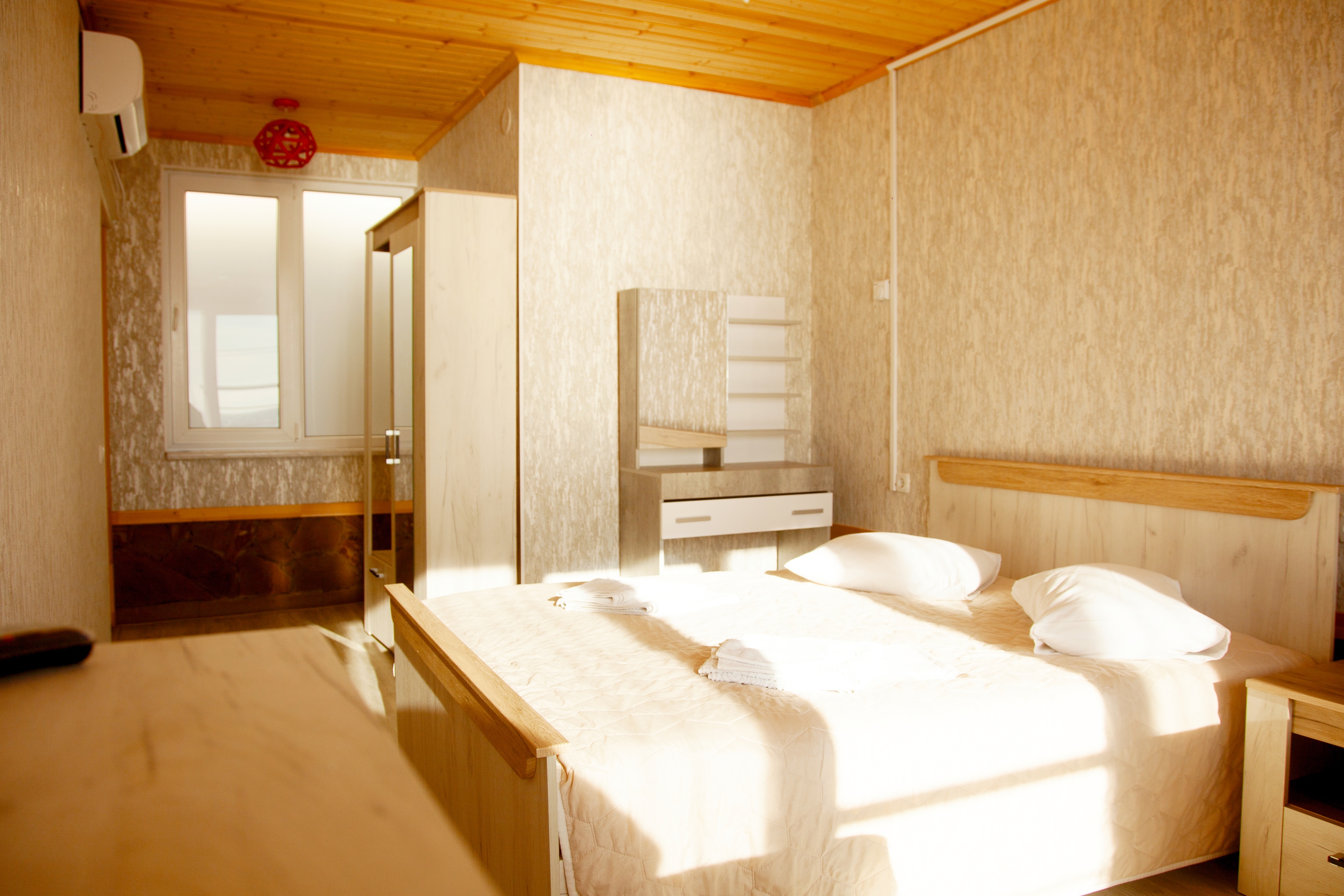 Большой просторный номер с видом на море! 2 основных места большая двуспальная кровать + 2 допместа (детских) диван кровать. В номере большой телевизор, холодильник, чайник, стол, стулья, комод, шкаф купе, кондиционер, зеркало. Шикарный вид на море.